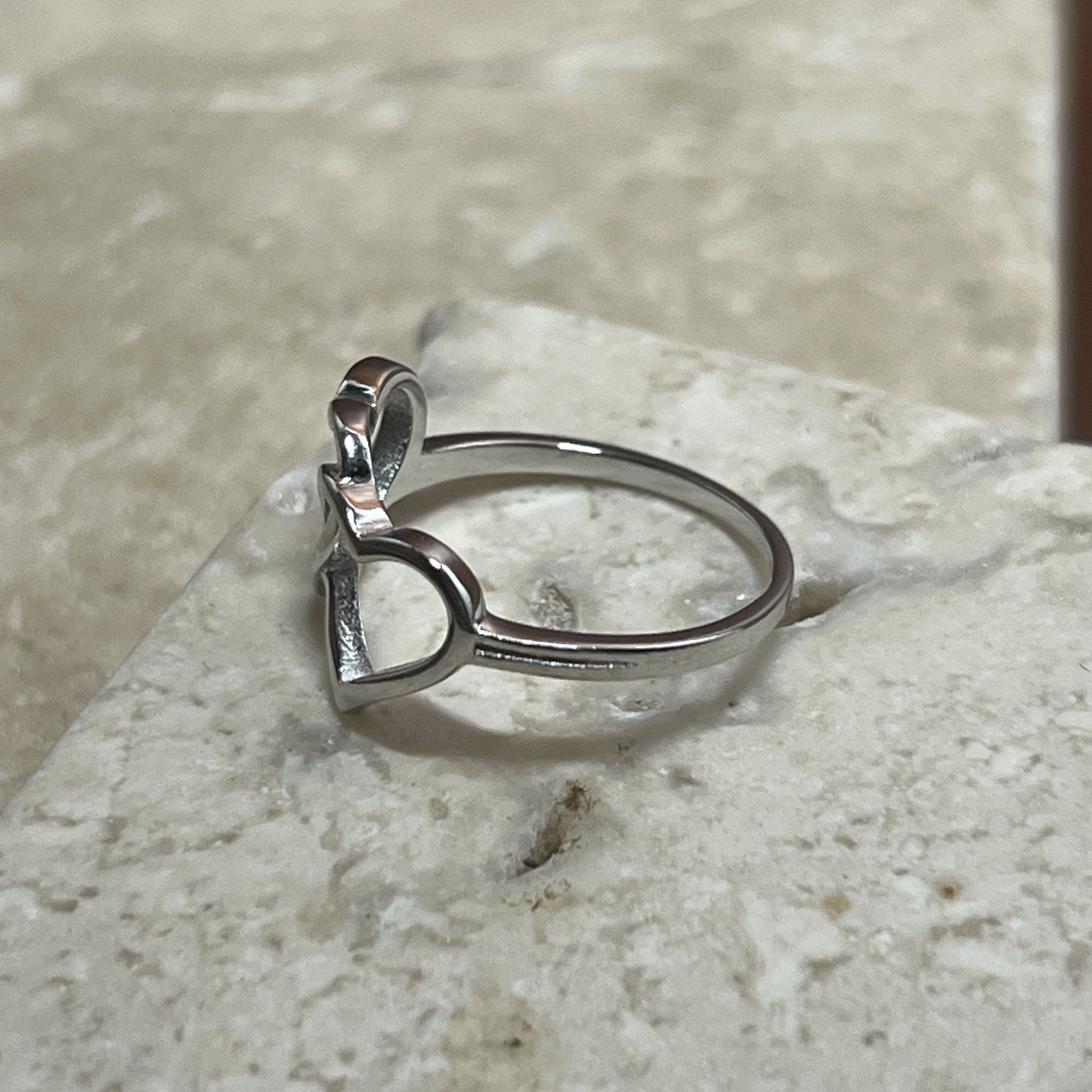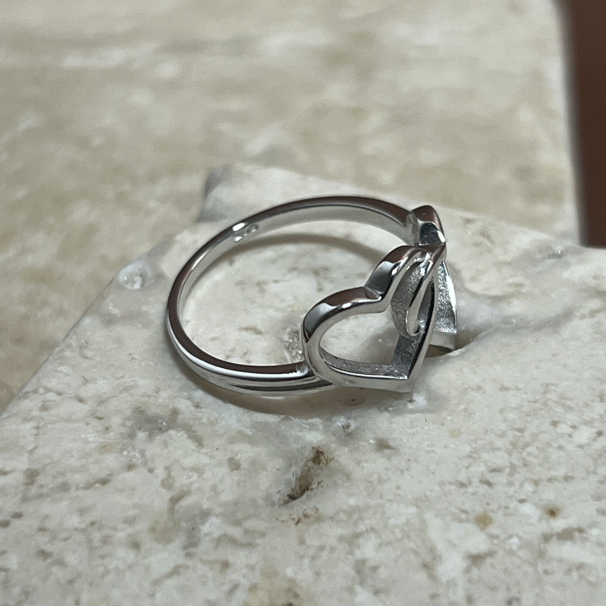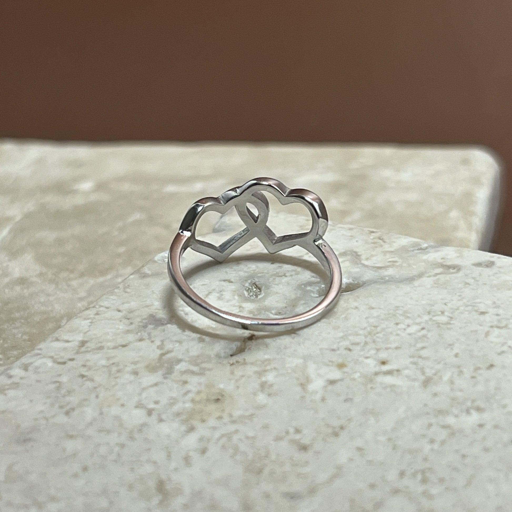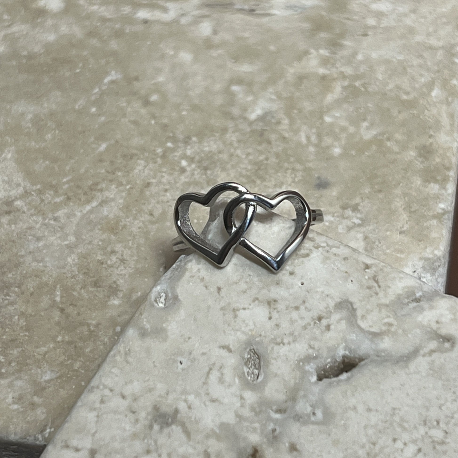 This sterling silver ring features two heart outlines intertwined, symbolizing connection, unity, and shared strength. The minimalist design creates a subtle yet powerful statement about love that’s layered and enduring. Perfect for anyone who treasures deep bonds and affection.
