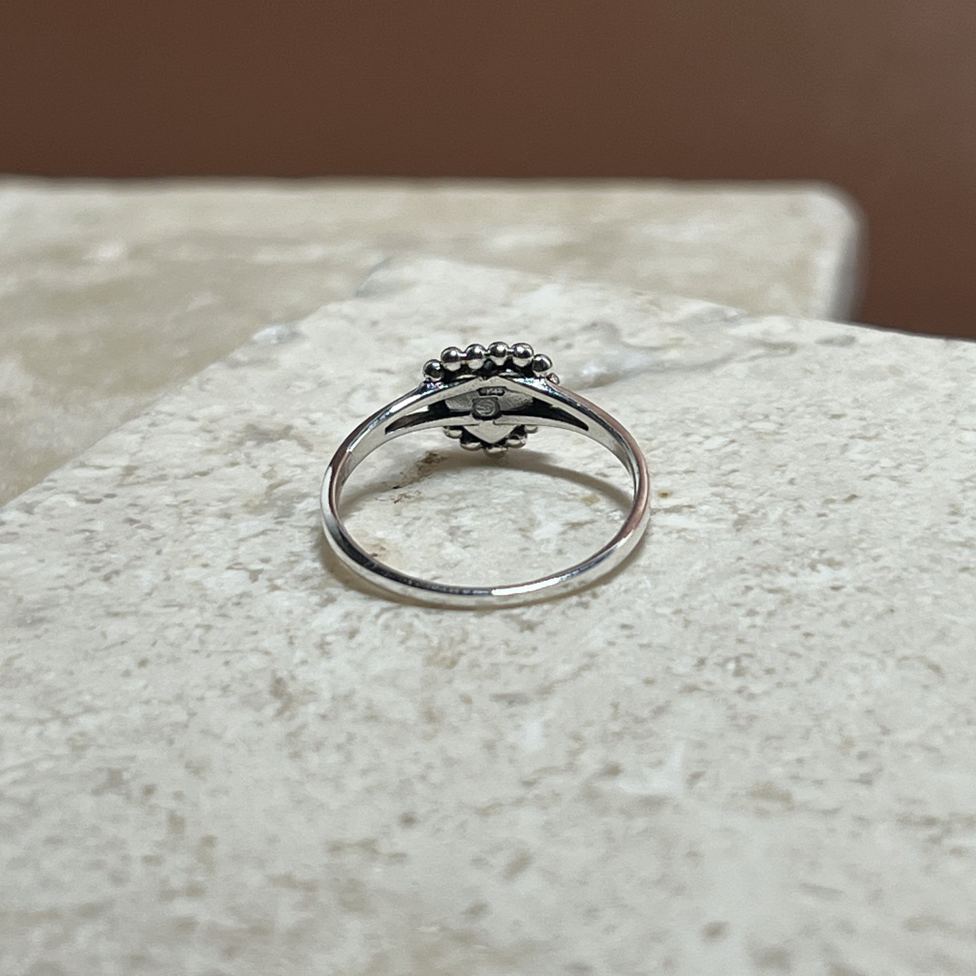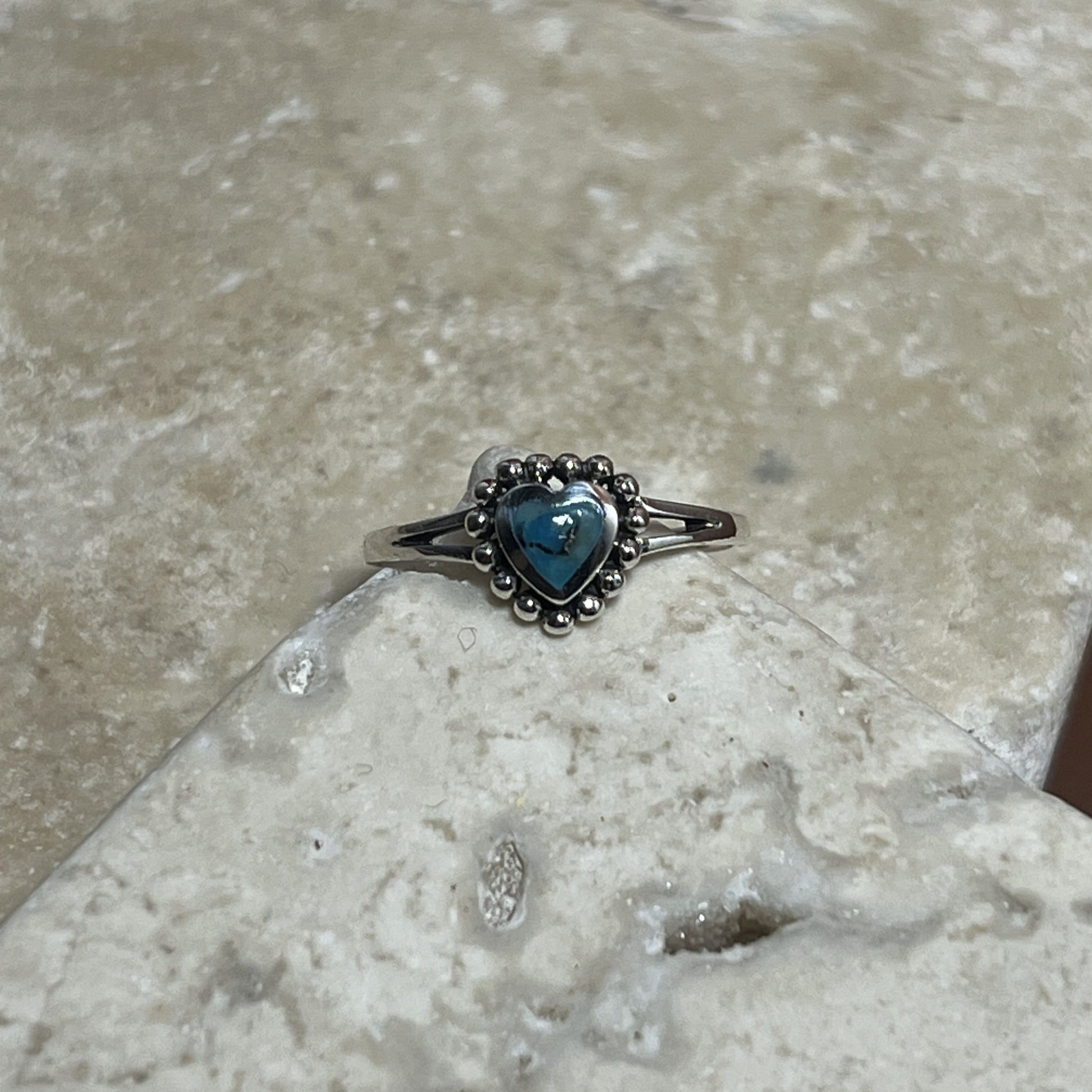 This sterling silver ring features a striking heart-shaped turquoise inlay, blending the raw strength of iron with the calming energy of turquoise. The vibrant blue-green stone adds a splash of color and meaning, symbolizing protection, wisdom, and enduring love. Designed for those who carry a fierce heart and a grounded soul.