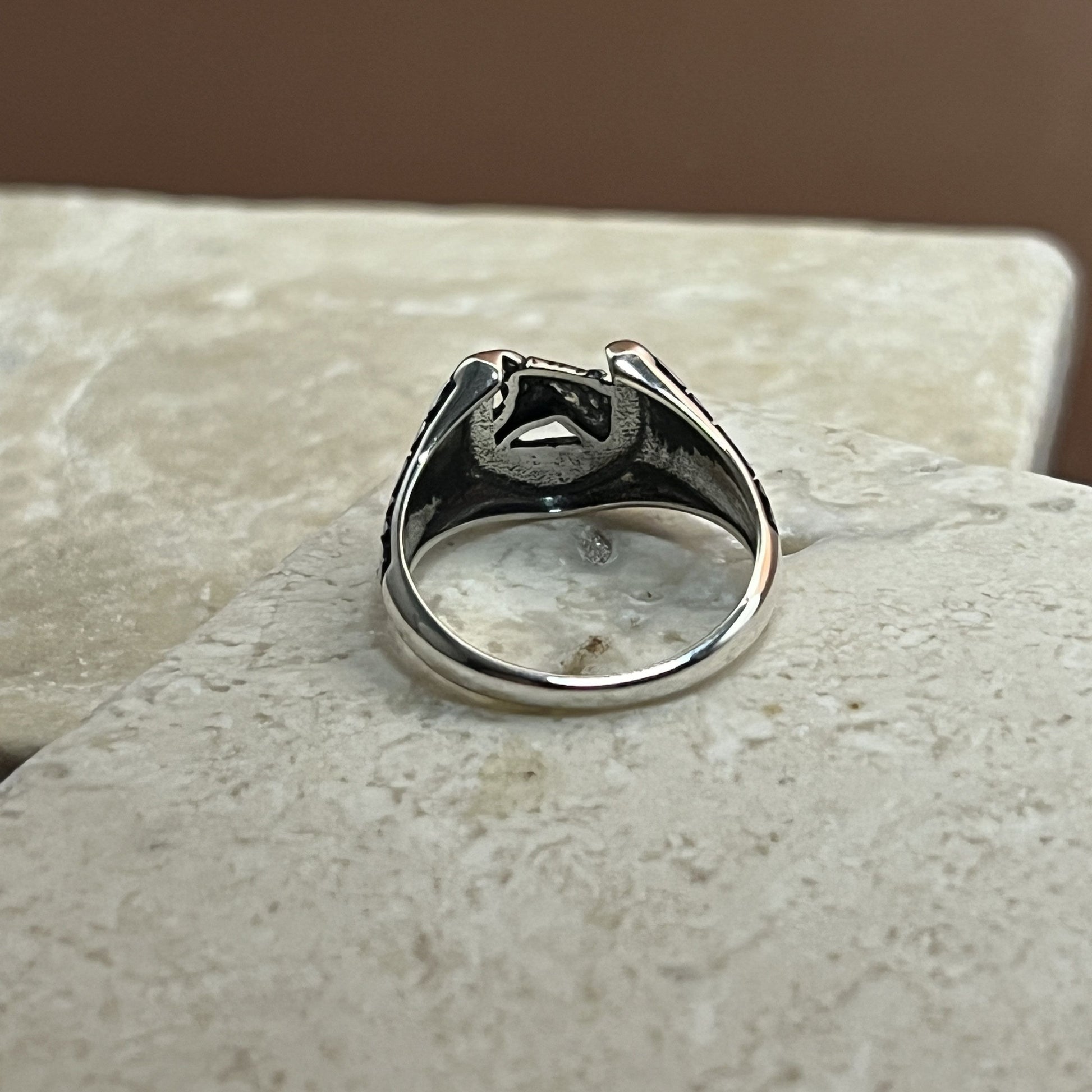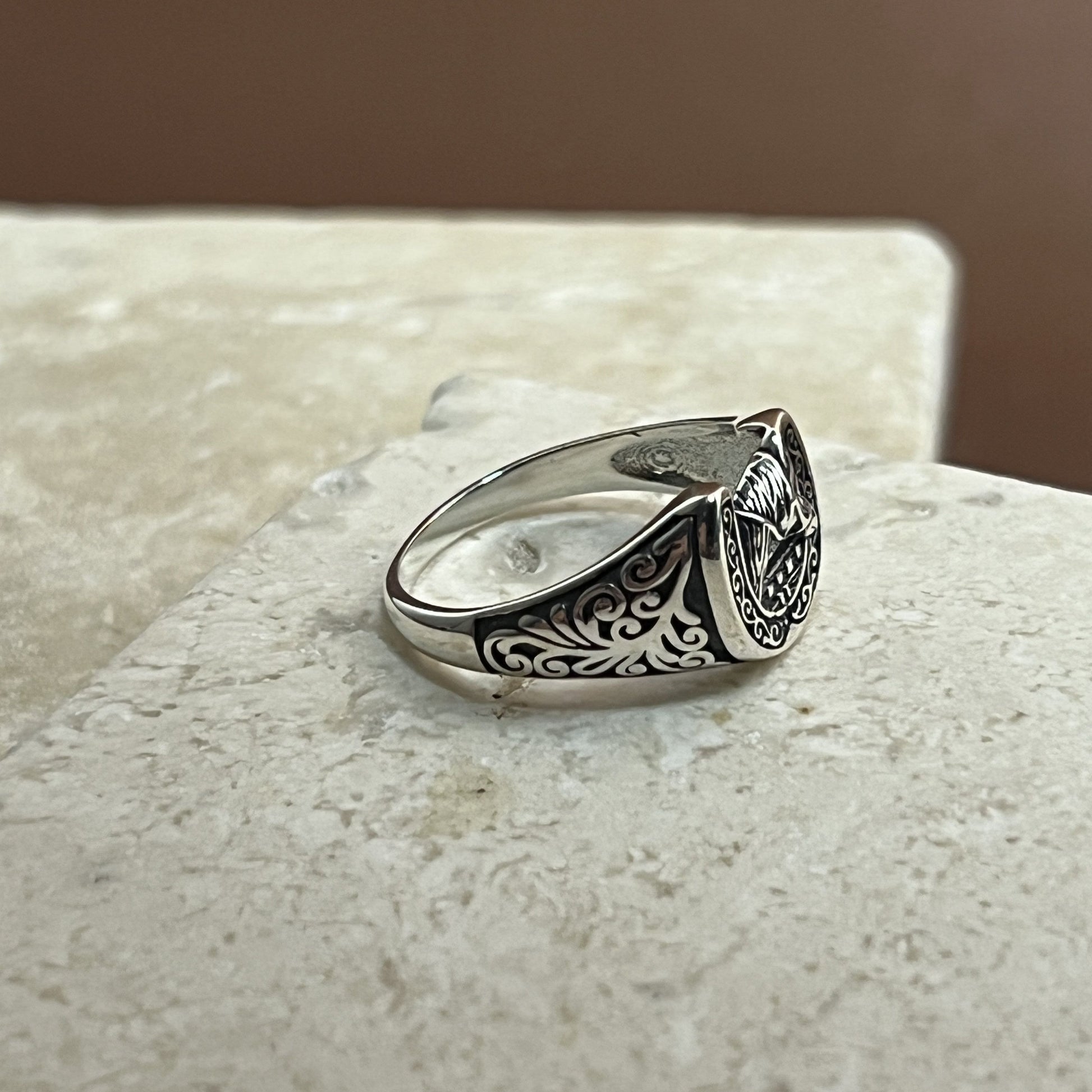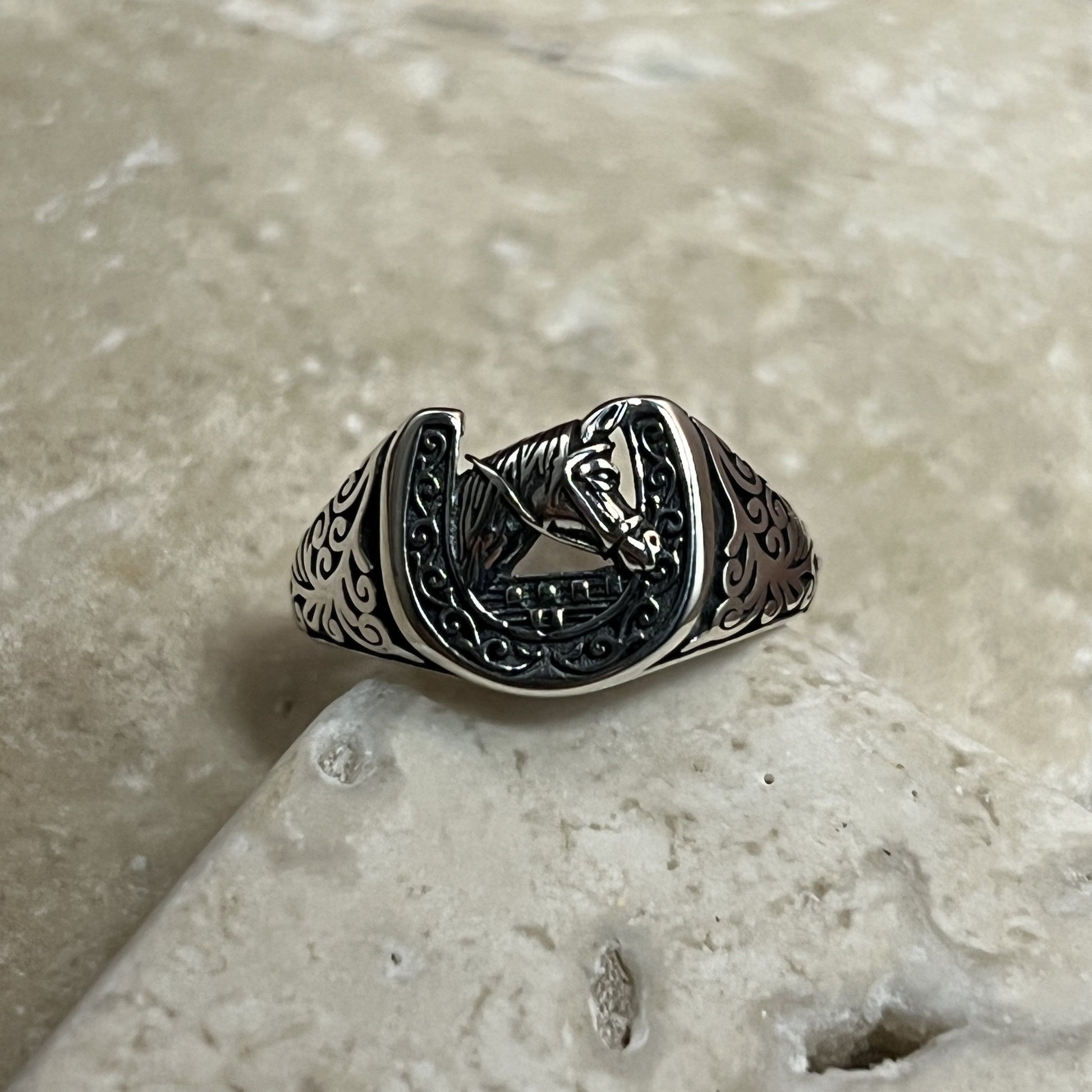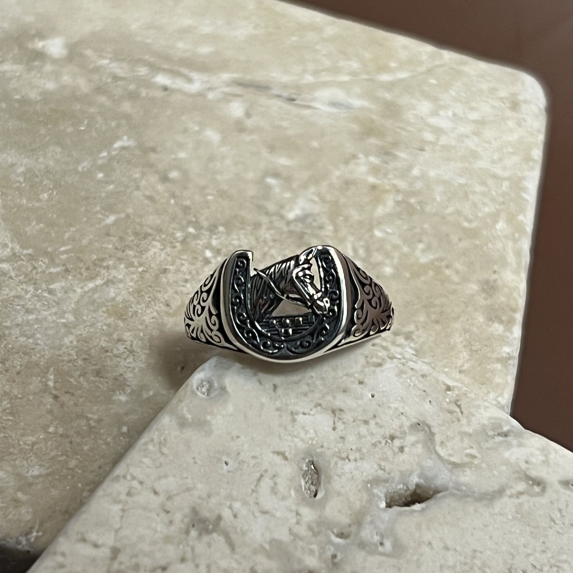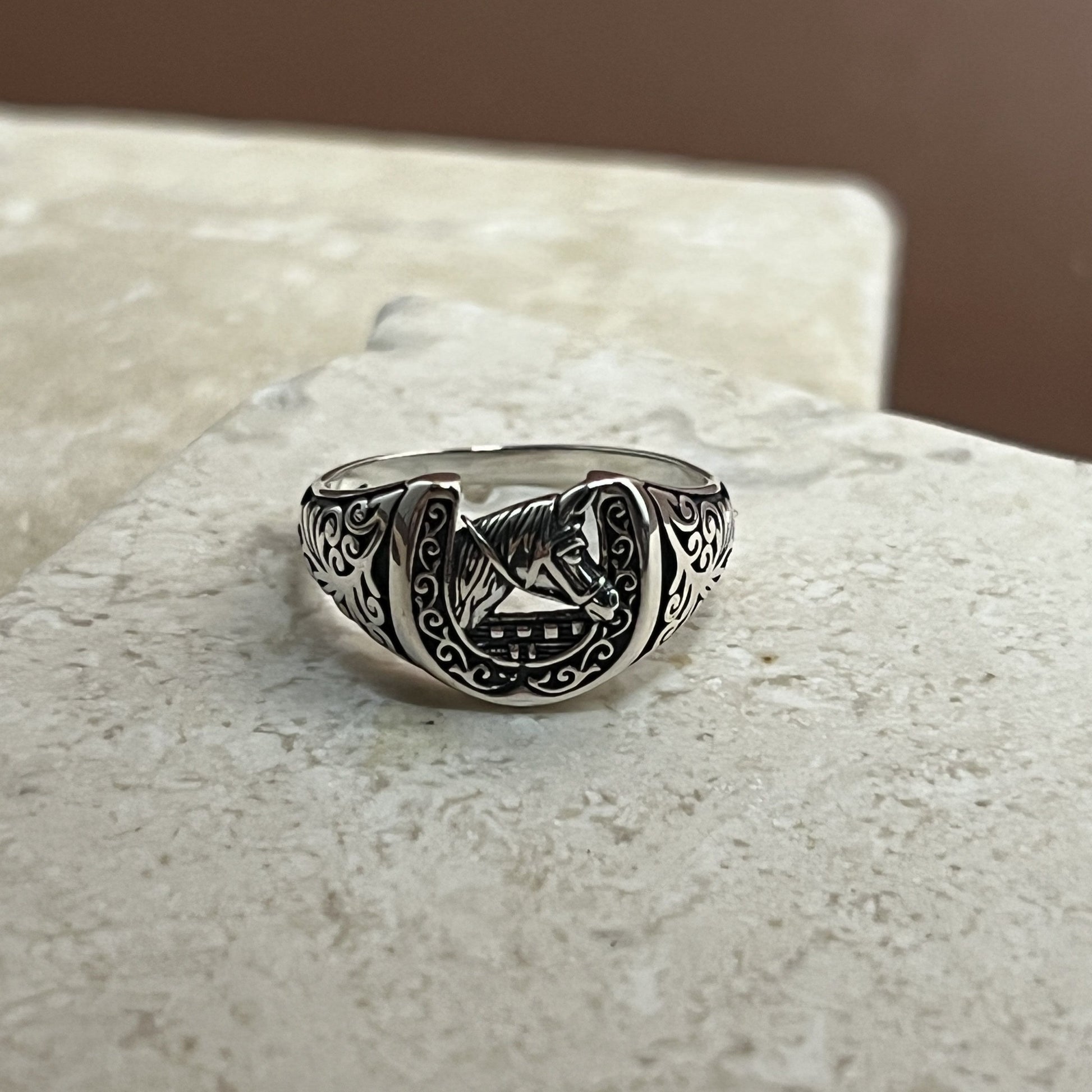 A rugged yet refined piece that captures the heart of western style. Crafted in solid sterling silver, this ring features a proud horse framed by a classic horseshoe. Etched with detailed vine engravings. An overall symbol of strength, freedom, and fortune. This ring is perfect for riders, rebels, and anyone with an untamed soul.