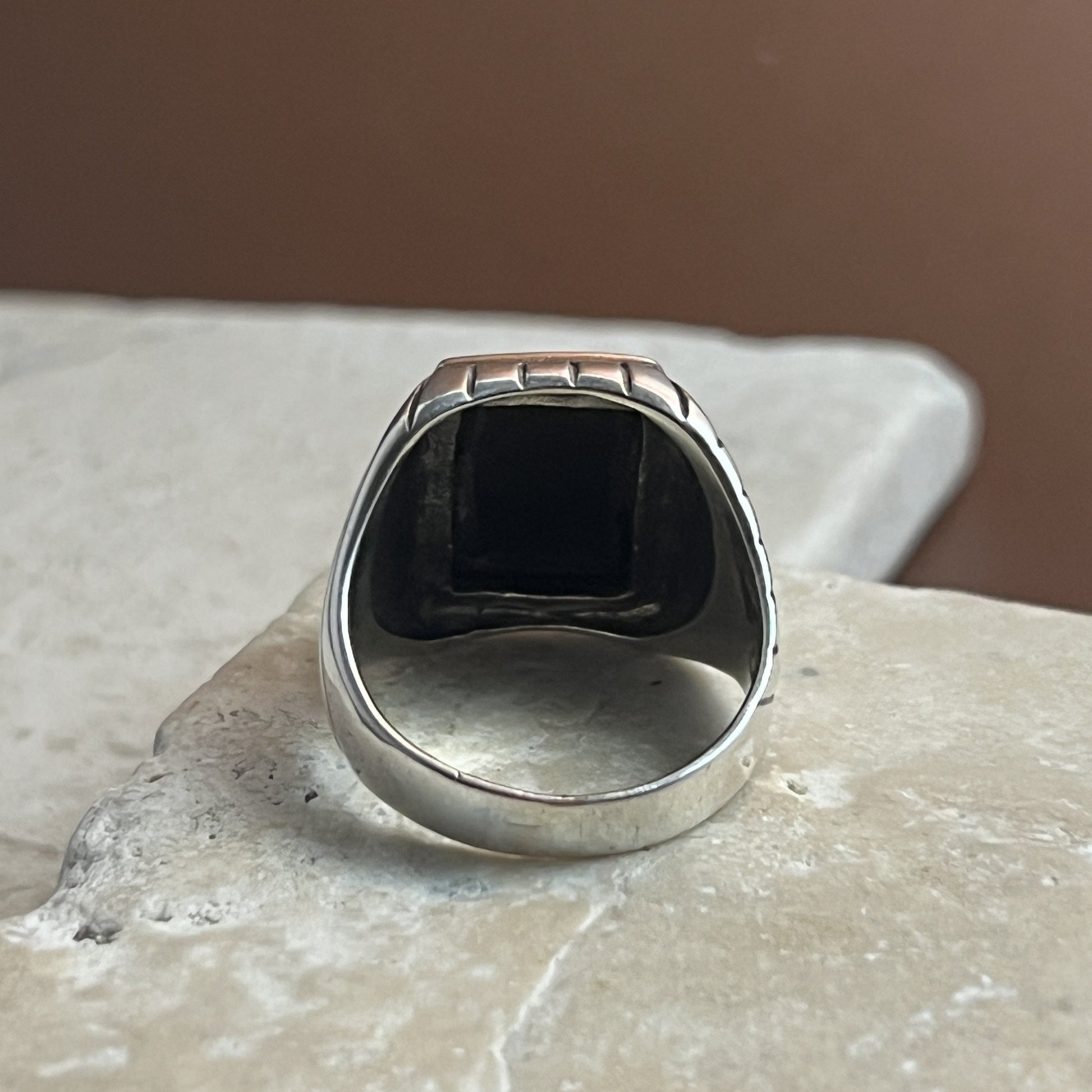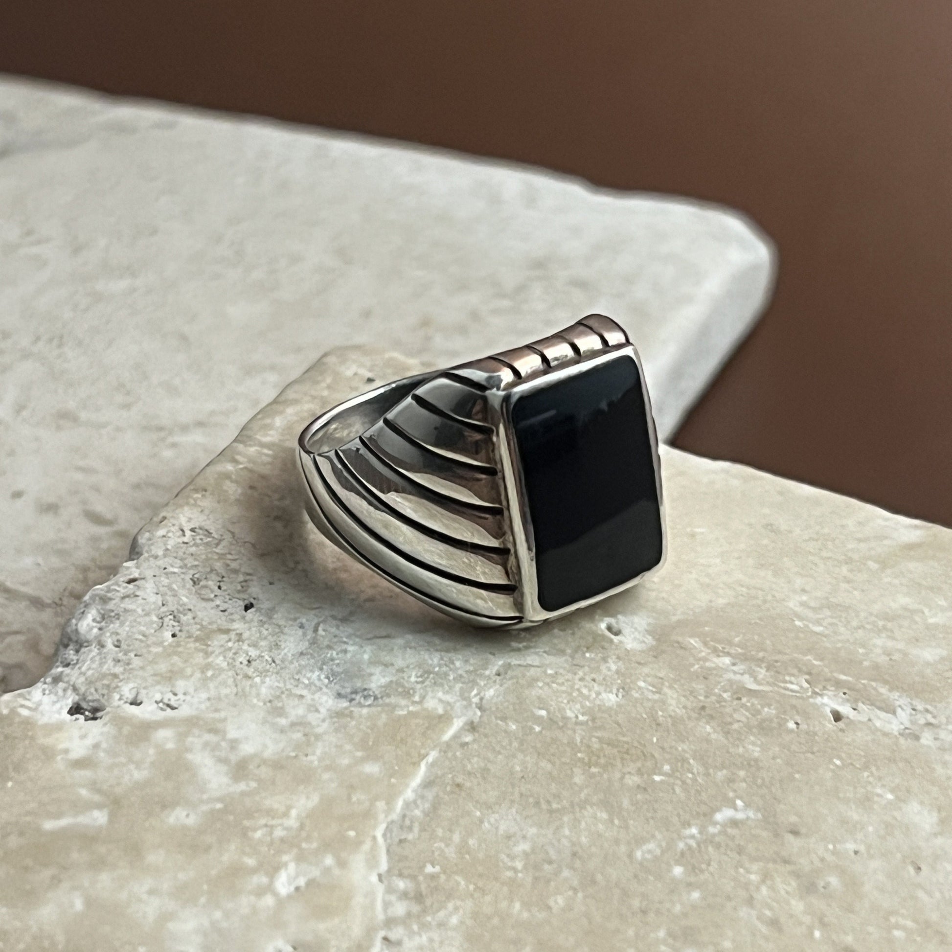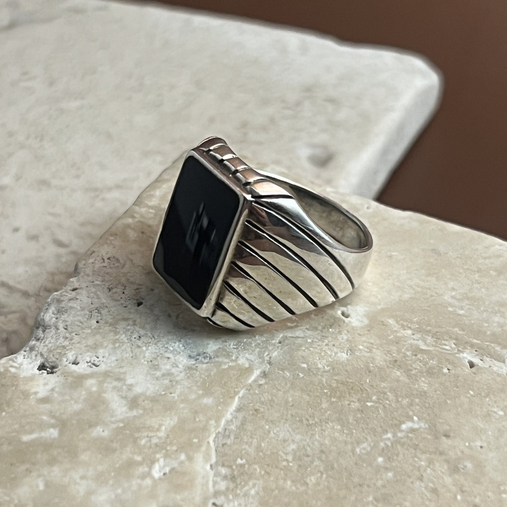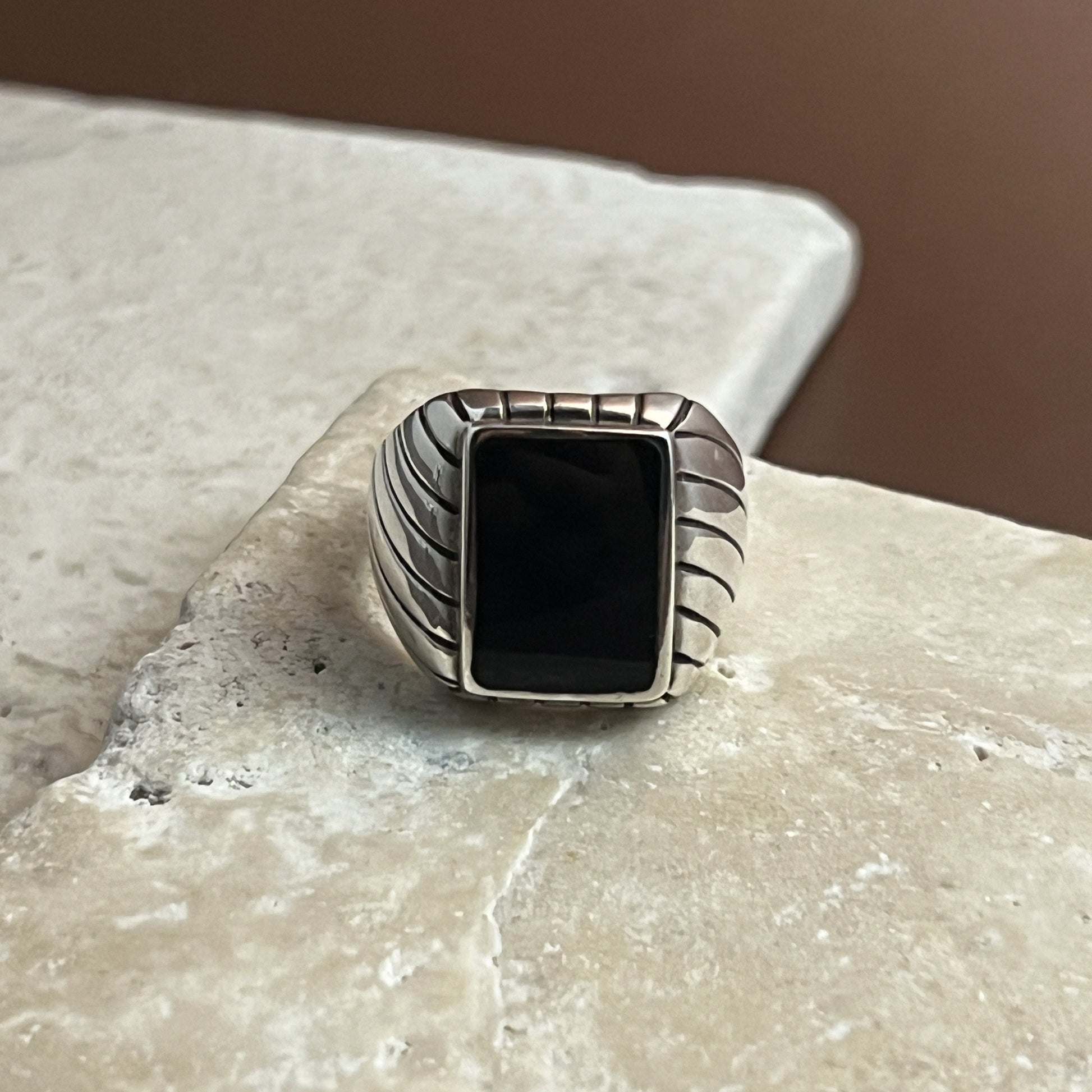 Command attention with this striking black onyx ring, designed with a bold edge for the modern man. Set in solid sterling silver, the deep onyx stone is framed by a distinctive striped pattern that adds texture, contrast, and a sense of timeless strength. A powerful symbol of confidence and grounded energy, this ring is perfect for everyday wear or as a meaningful statement piece.